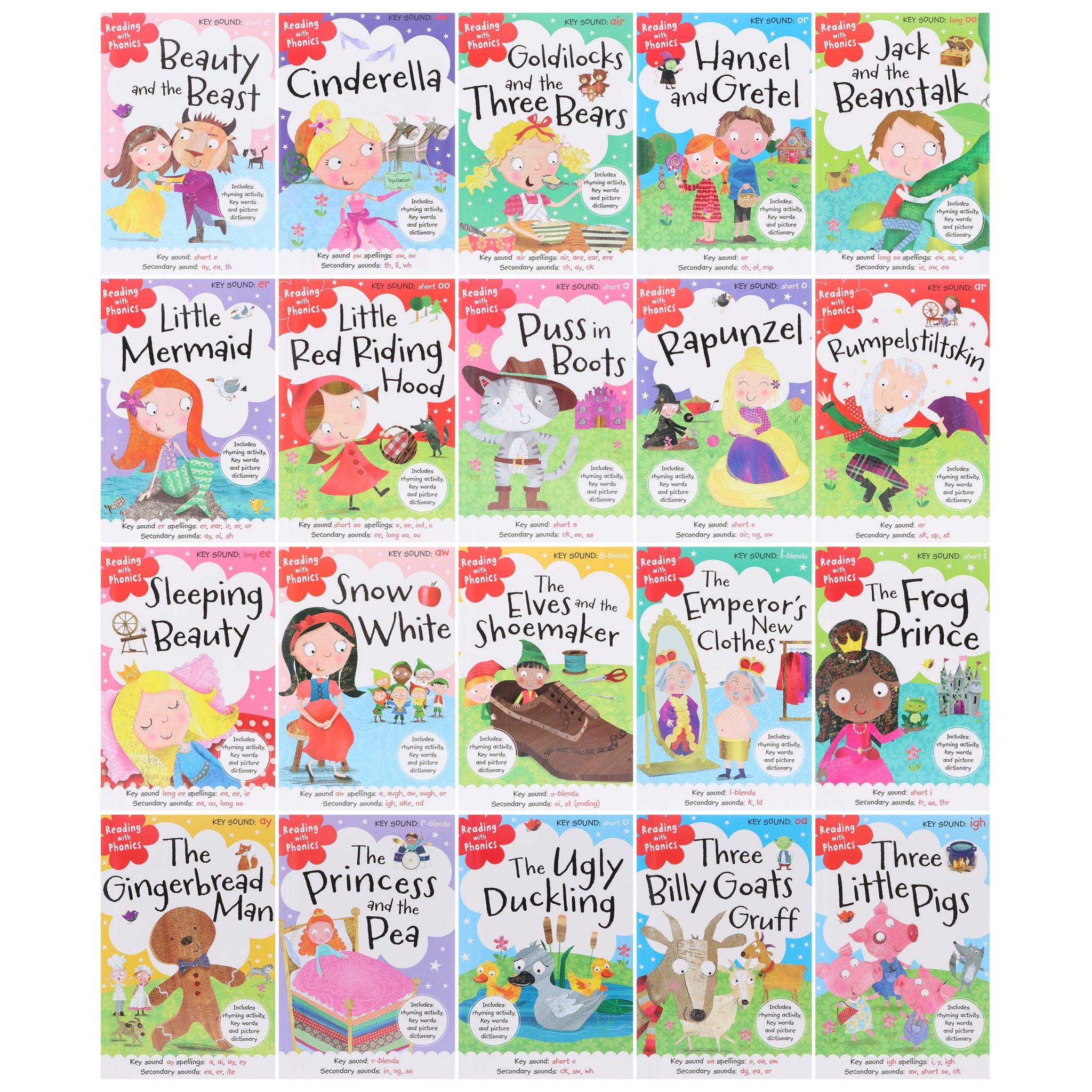 This Reading with Phonics collection features a host of fairy tales and they all focus on different key sounds e.g. The Ugly Duckling is based around a 'short U'; Rumpelstiltskin includes 'ar' and the secondary sounds 'sp', 'sk' and 'st'; and The Elves and the Shoemaker uses the 's-blend' and secondary sounds including 'oi' and 'st'.