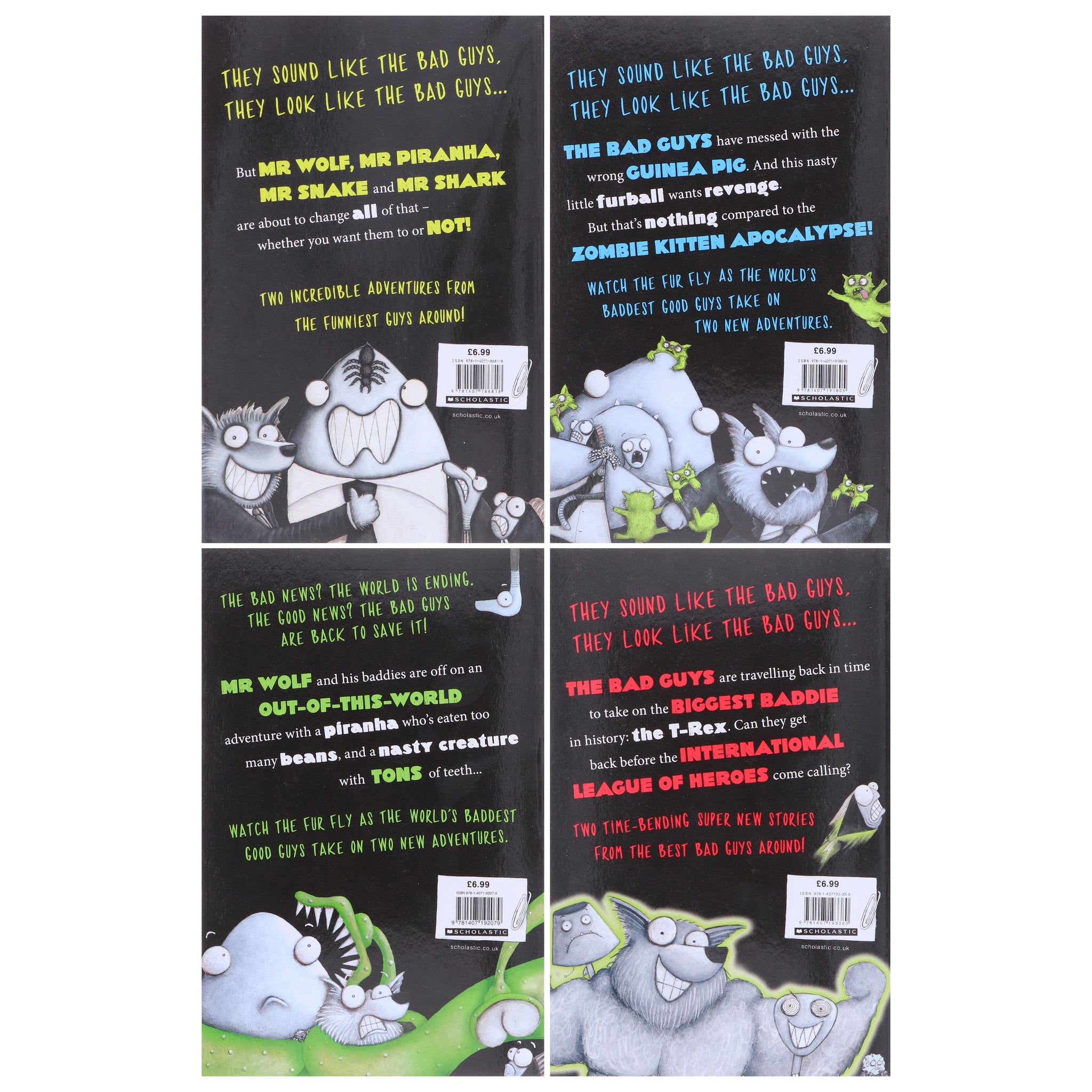 They sound like the Bad Guys, they look like the Bad Guys... and they even smell like the Bad Guys in this fully illustrated, laugh-out-loud adventure. Mr Wolf and his bad, bad buddies, Mr Piranha, Mr Snake and Mr Shark, have messed with the wrong guinea pig. And this nasty little furball wants revenge. But thats nothing compared to the ZOMBIE KITTEN APOCALYPSE! Should you panic? Should you cry? NO! Just sit back and watch the fur fly as the world's baddest good guys take on two new adventures.
